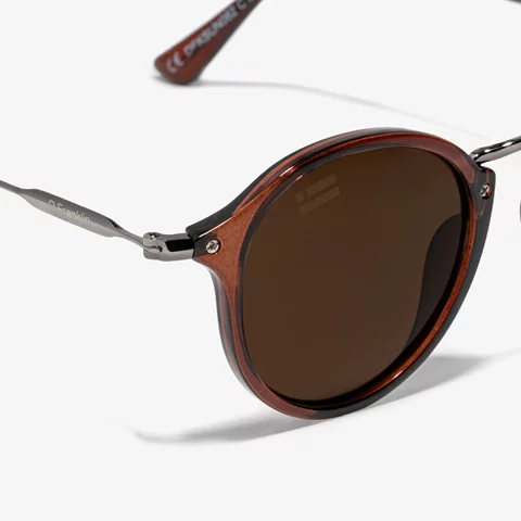 Οι στρογγυλεμένοι καφέ αποχρωματισμένοι φακοί και ο καφέ αποχρωματισμένος σκελετός ενισχύουν την αισθητική της δεκαετίας του '70 αυτού του μοντέλου. Διαθέτει την υπογραφή μαςD.Franklin λεπτομέρειες: το λογότυπο χαραγμένο και στους δύο μεταλλικούς κροτάφους και το έμβλημά μας στον δεξιό φακό. Με ένα lens πλάτος 49mm και έναΠλαίσιο μπροστινού πλάτους 148mm, αυτά τα γυαλιά κολακεύουν τα περισσότερα πρόσωπα.Οι πλευρικοί κροτάφοι έχουν μήκος 145 χιλιοστά.